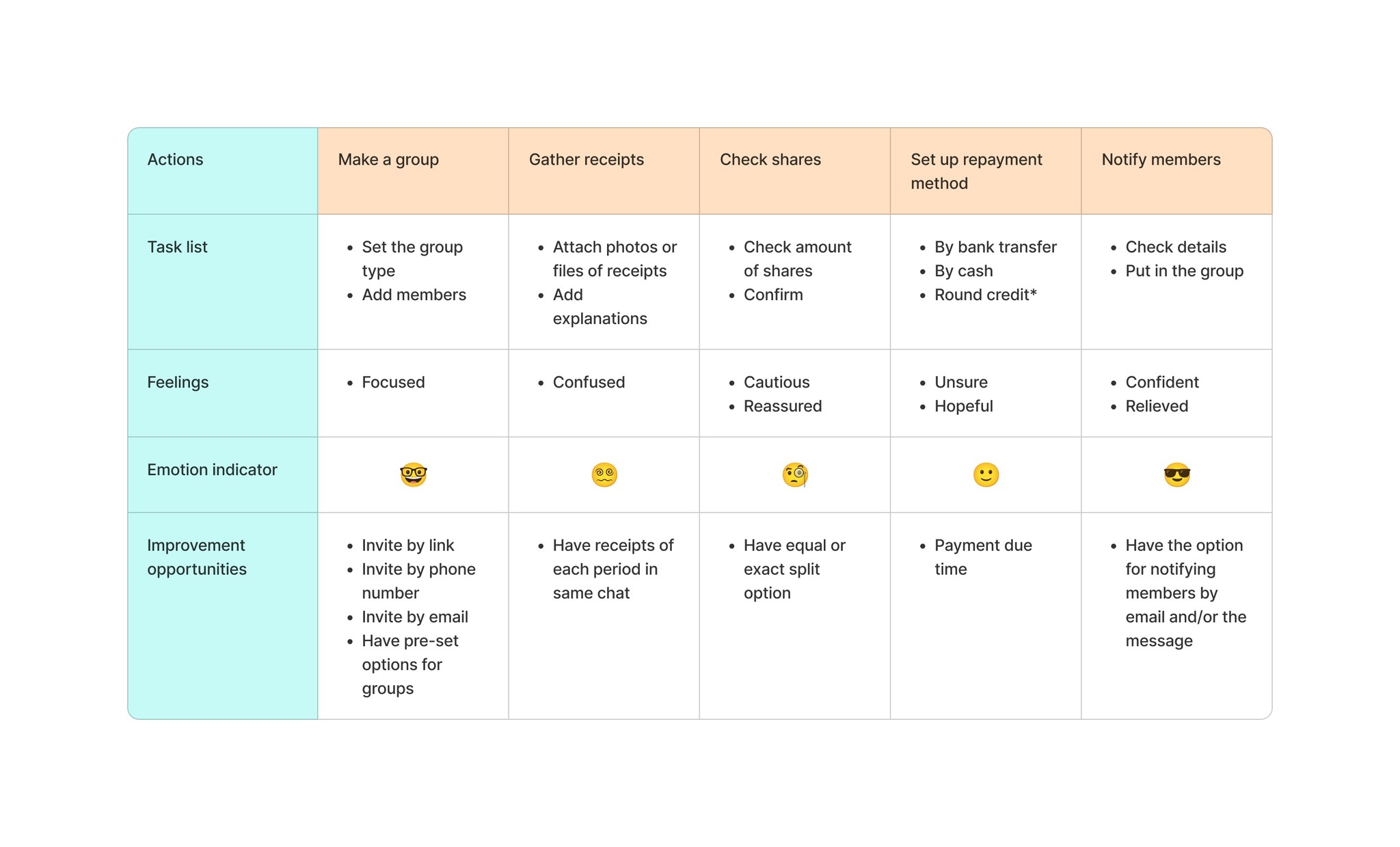 To better visualize the user’s overall experience and emotions while managing shared expenses, I created a user journey map based on interview findings and my primary persona’s behavior.