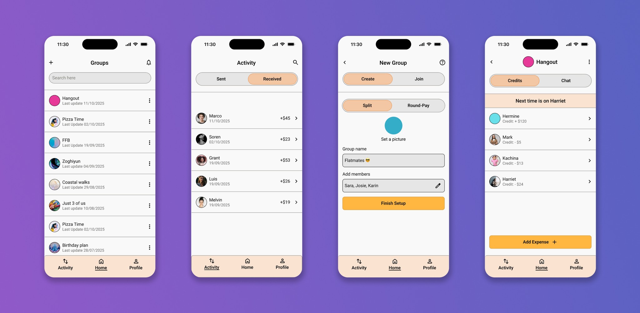 After finalising the visual design and layout, I built an interactive low-fidelity prototype to demonstrate the core user flows. The prototype shows how users can create a group, add expenses, and track shared balances in a simple and transparent way. It helped communicate the overall look and feel of the app and test its usability before extending the design to larger screens.